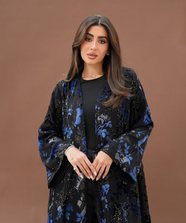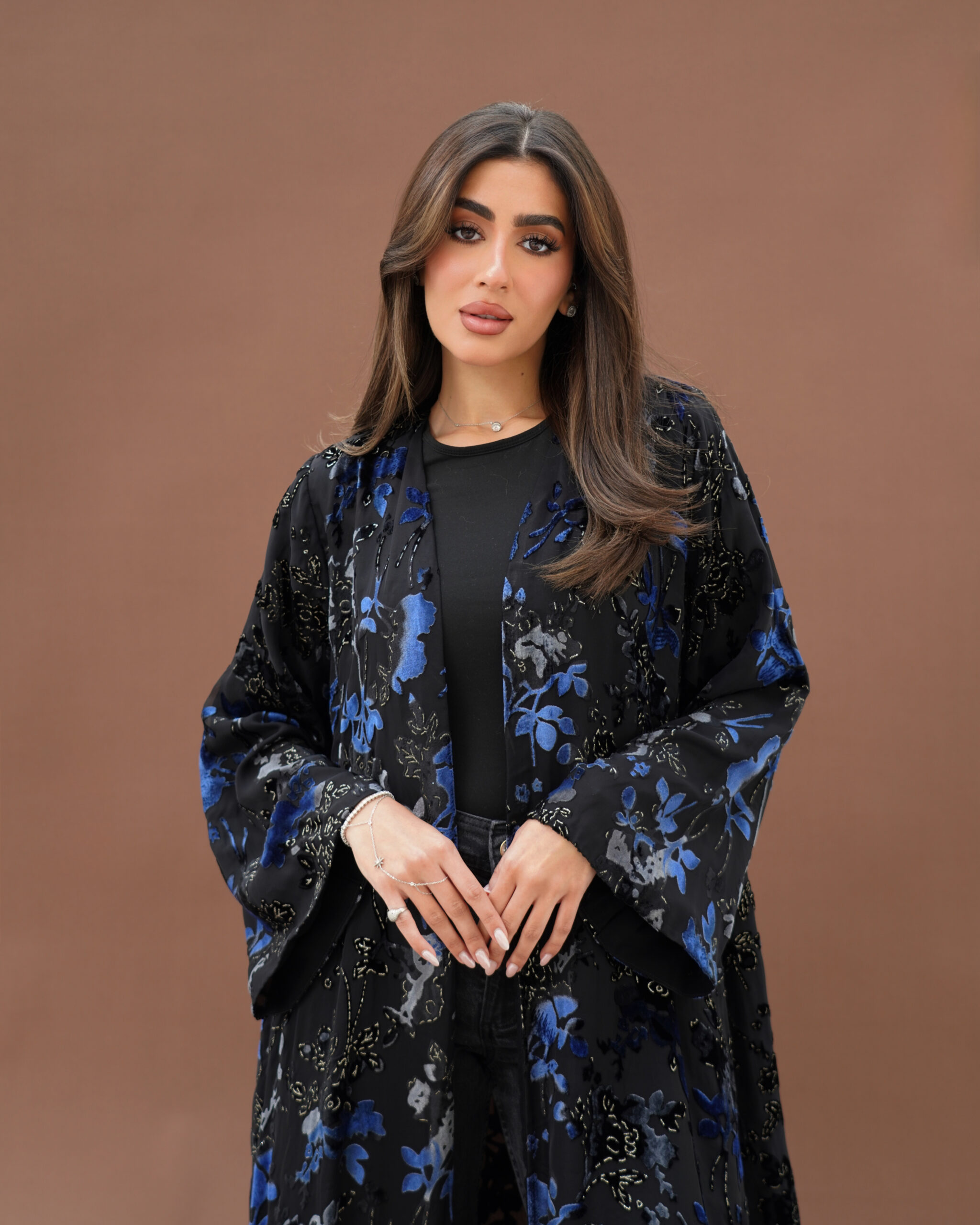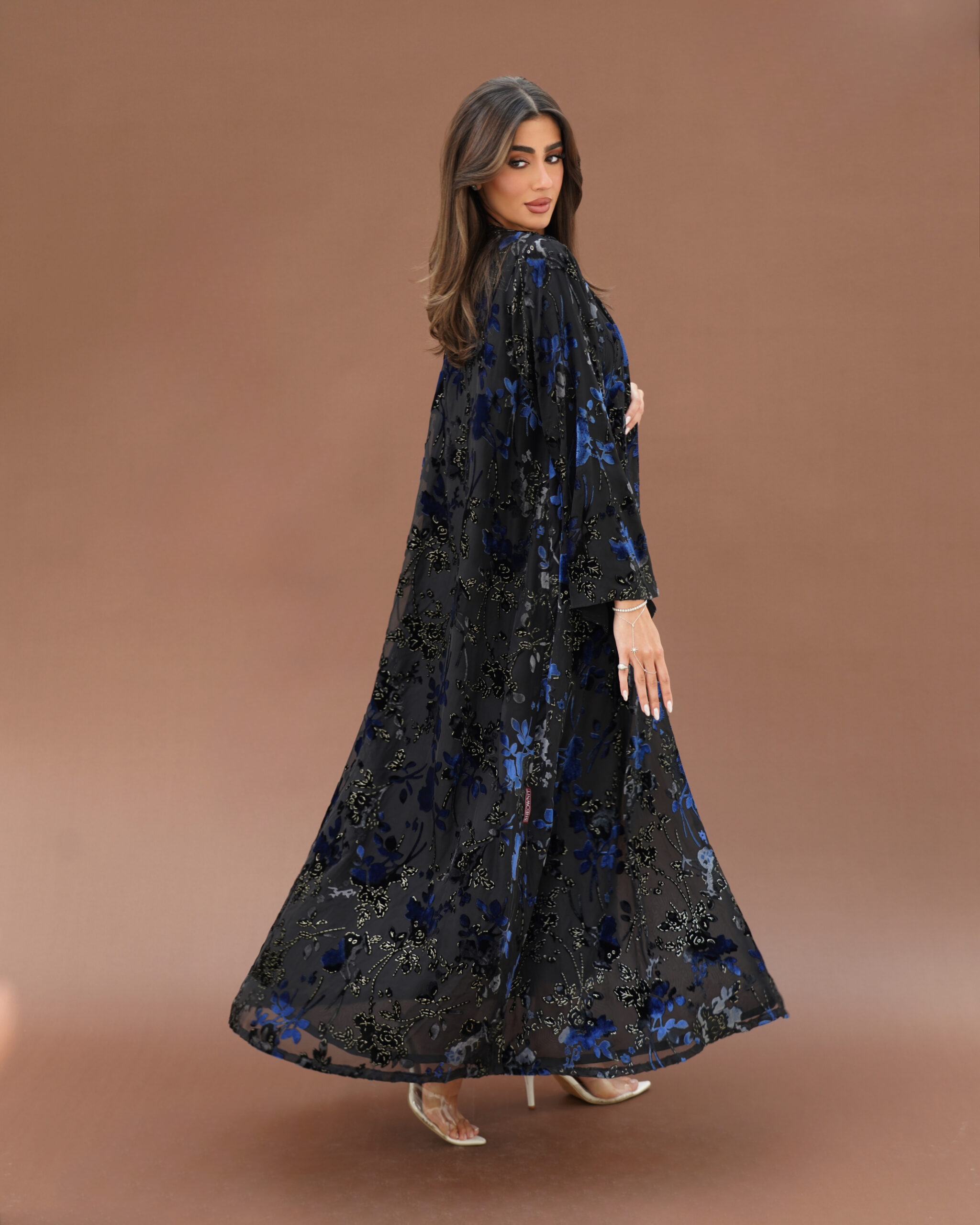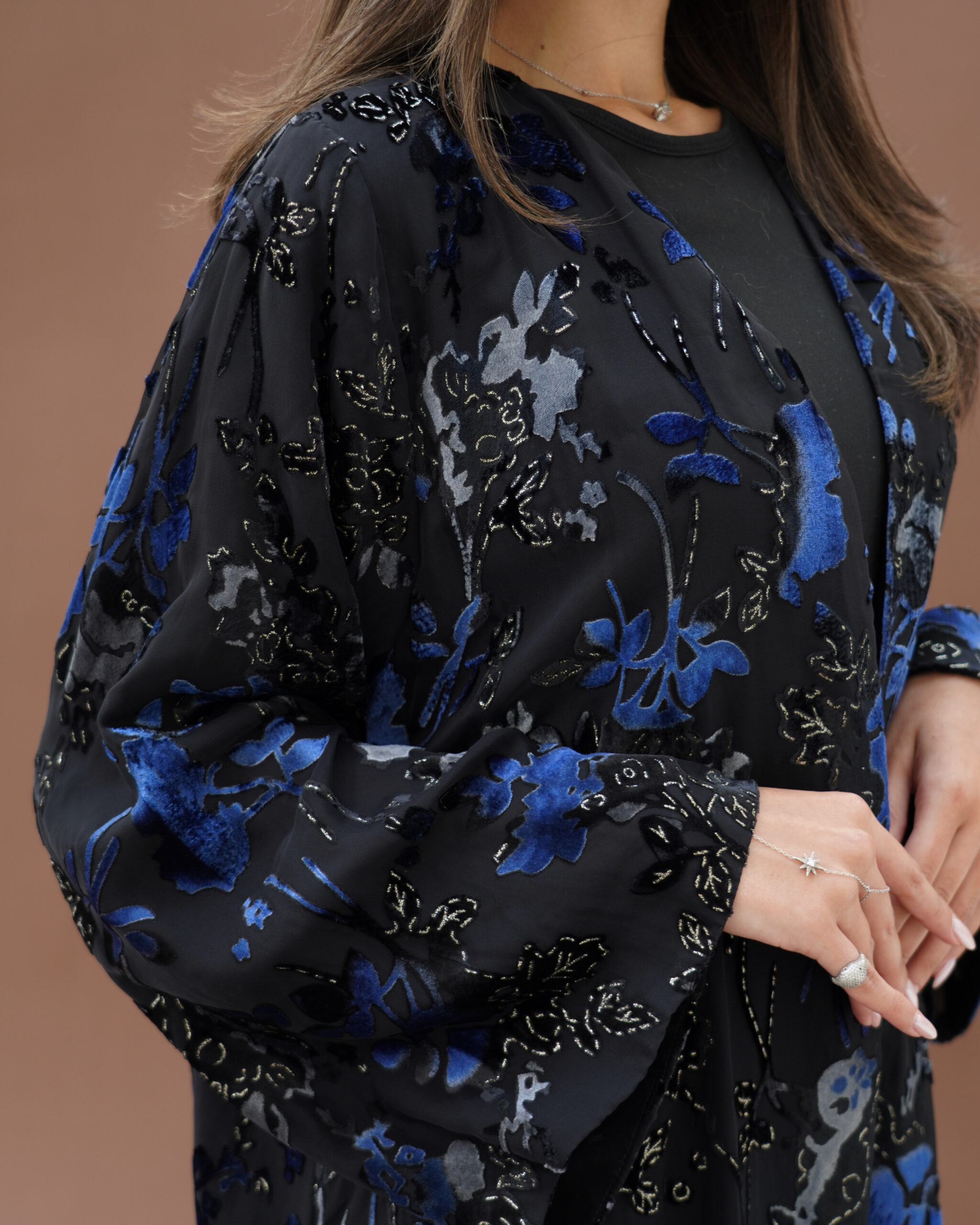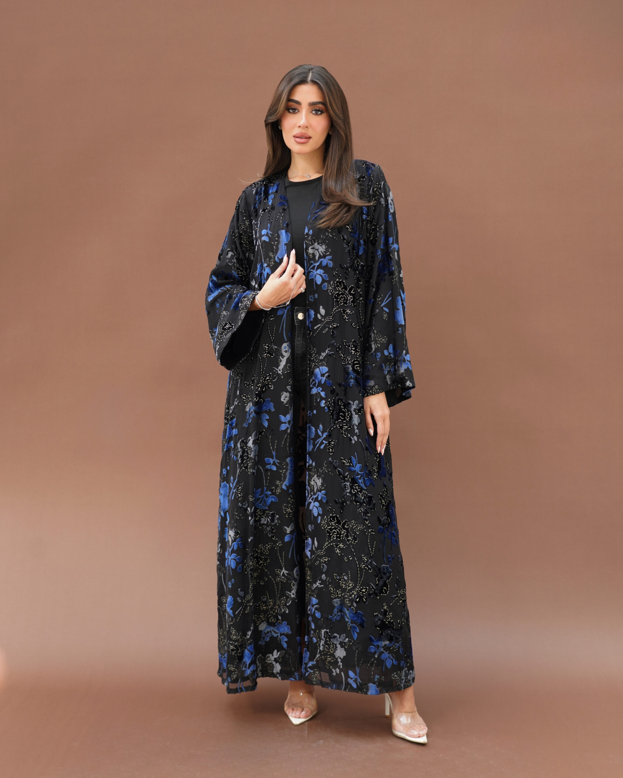 Elegant Straight cut abaya tailored from premium soft Mix Velvet fabric with chiffon, offering graceful drape and fluid movement modern finish. Comes with a plain sheila. No inner dress included.