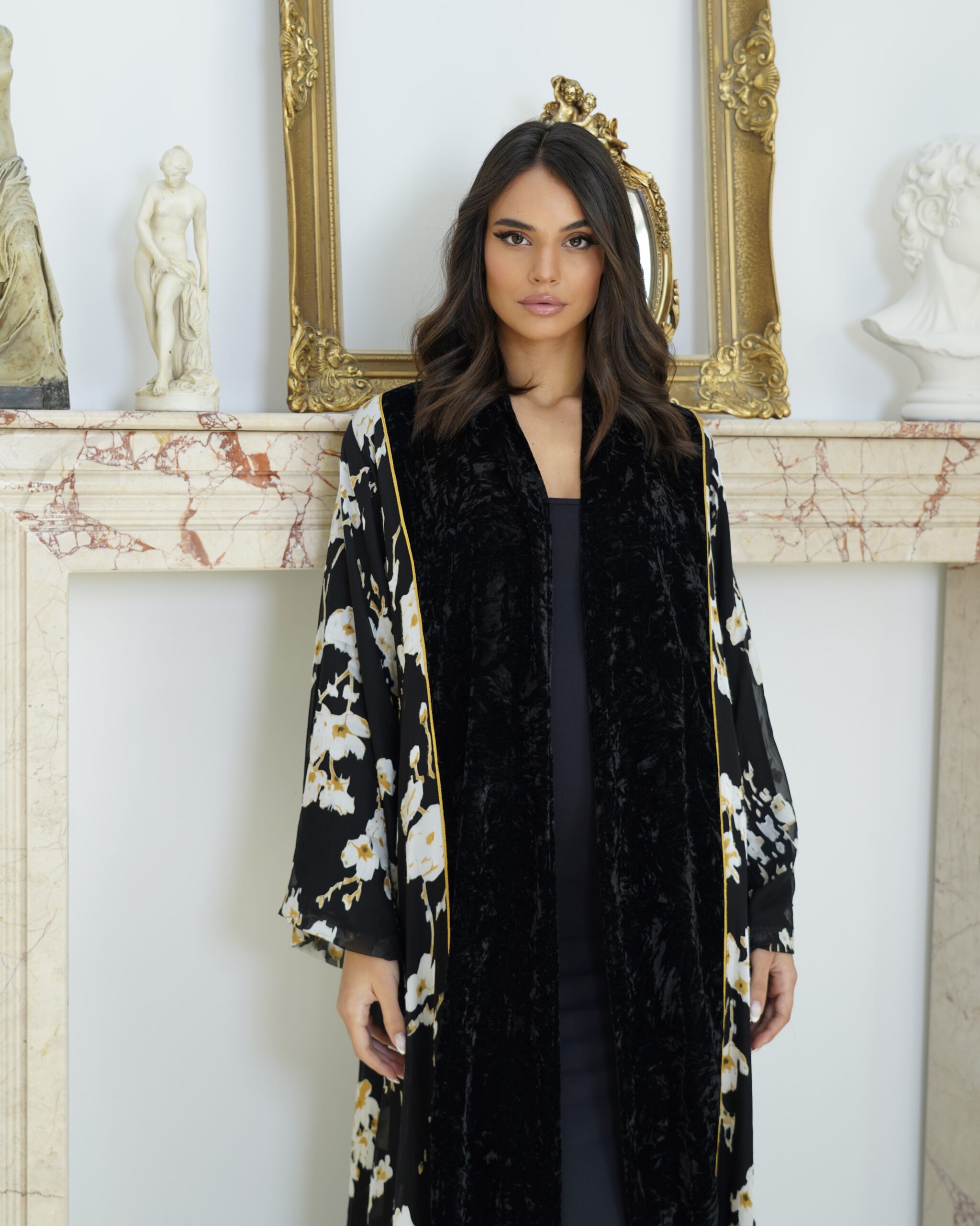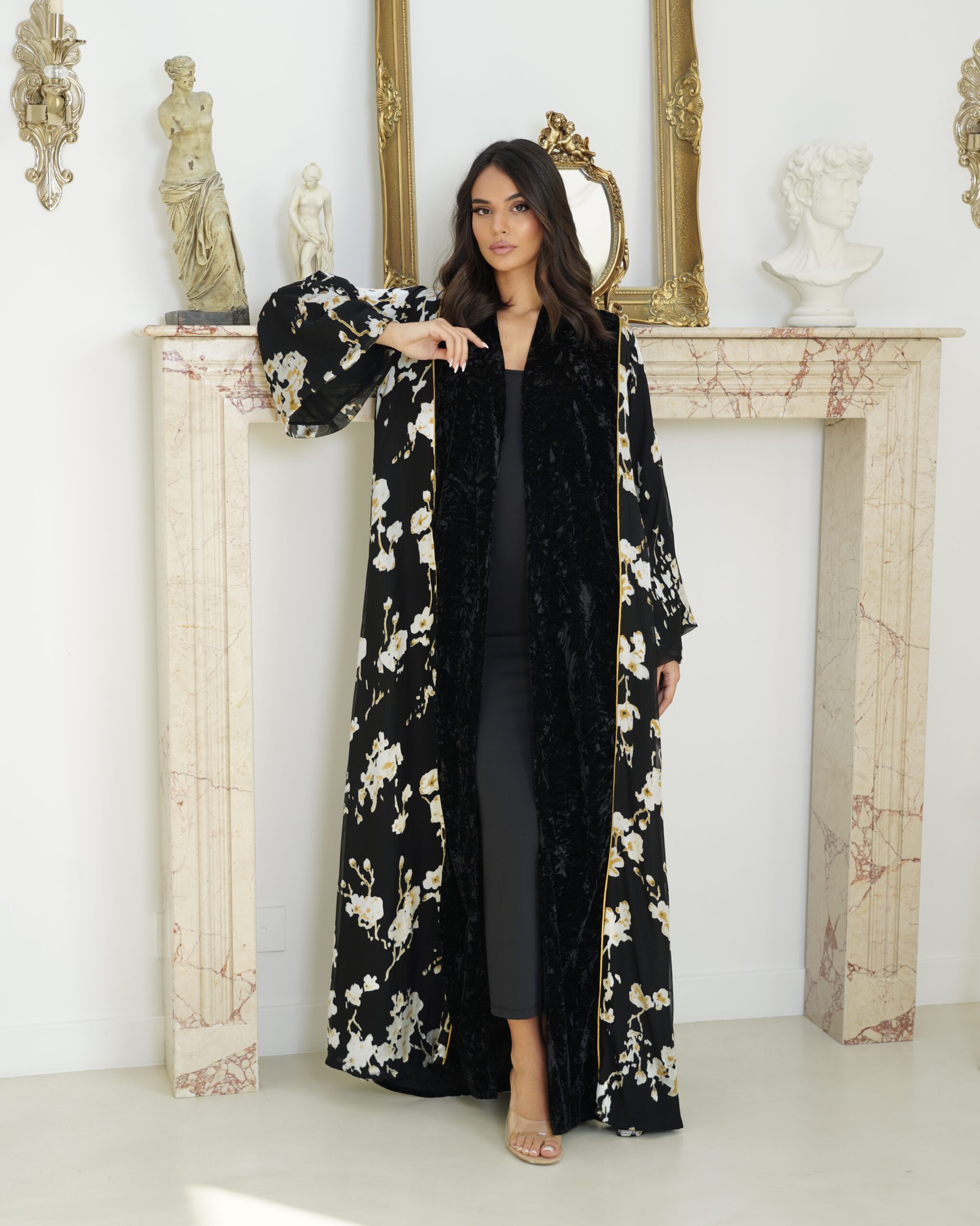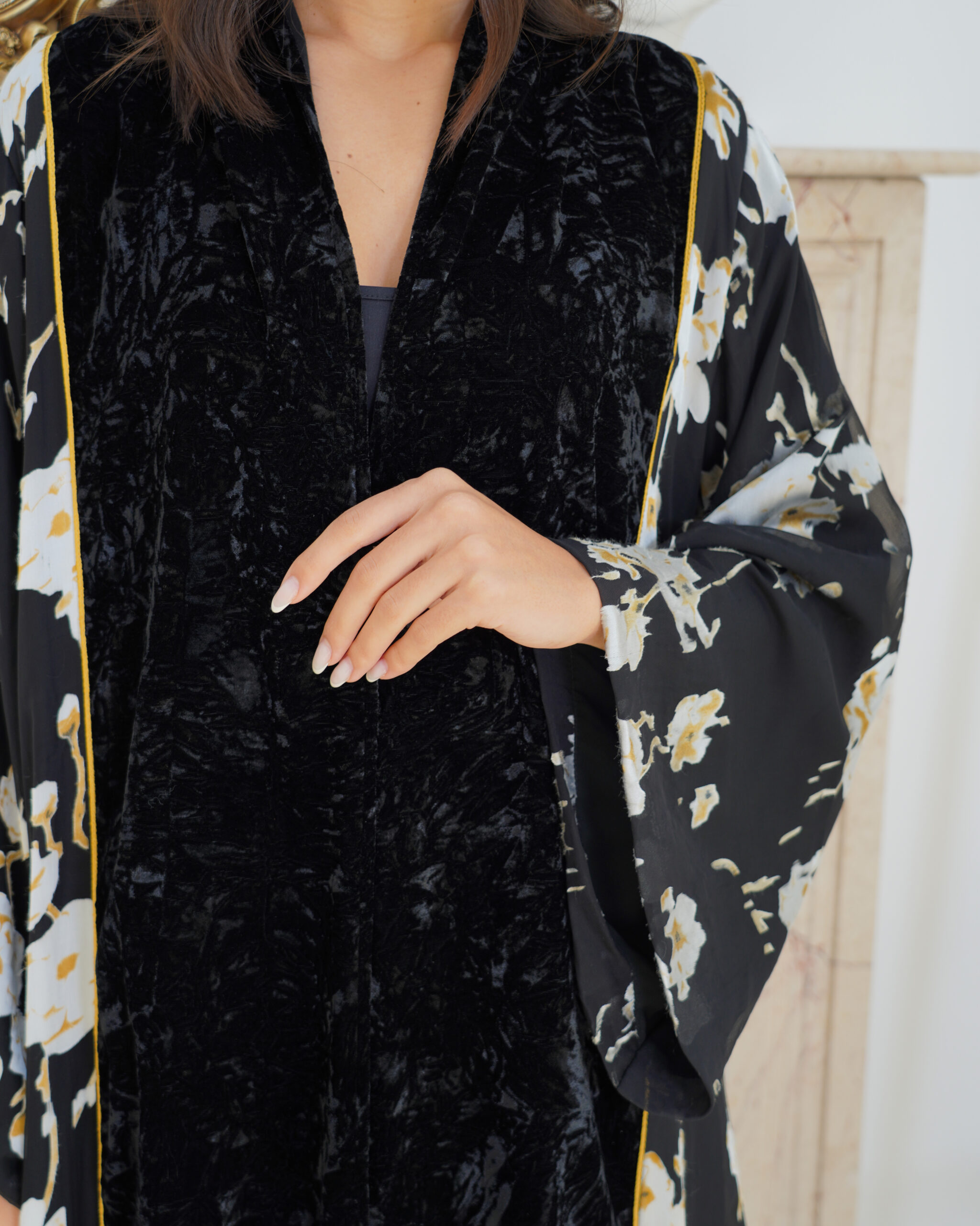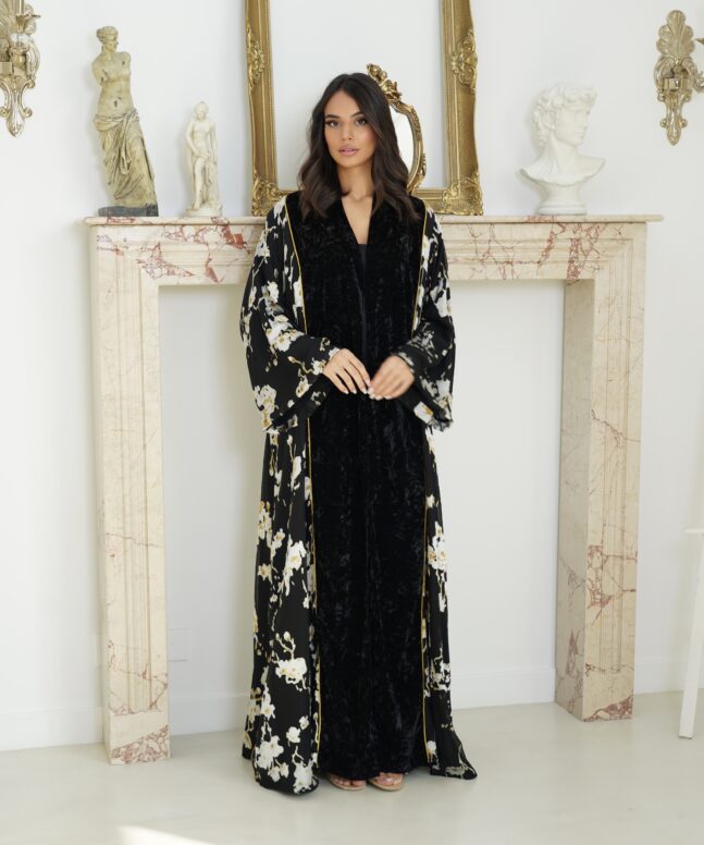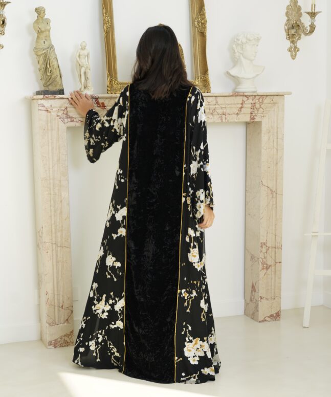 Abaya description : Velvet abaya with silk chiffon without dress. Plain shiela is included.