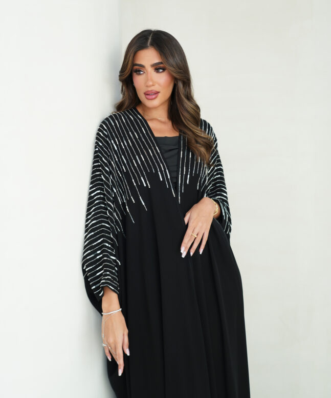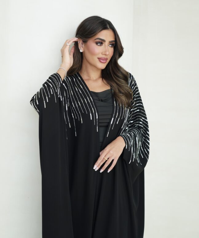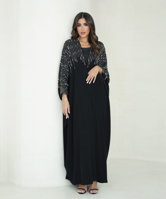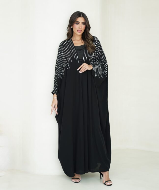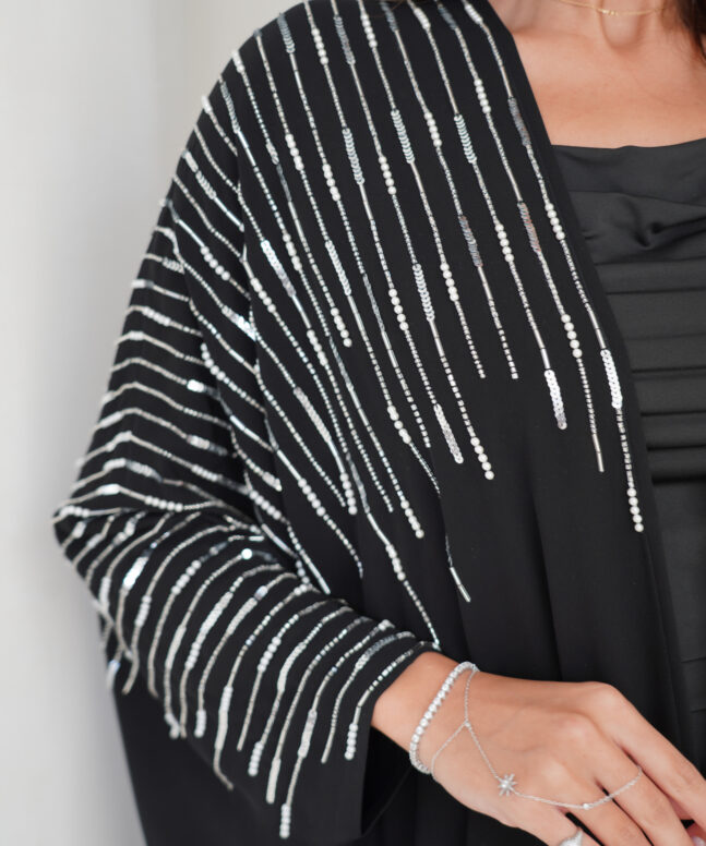 Abaya description: light crepe fabric Abaya with silver handwork beads Japan, Plain shiela is included.
