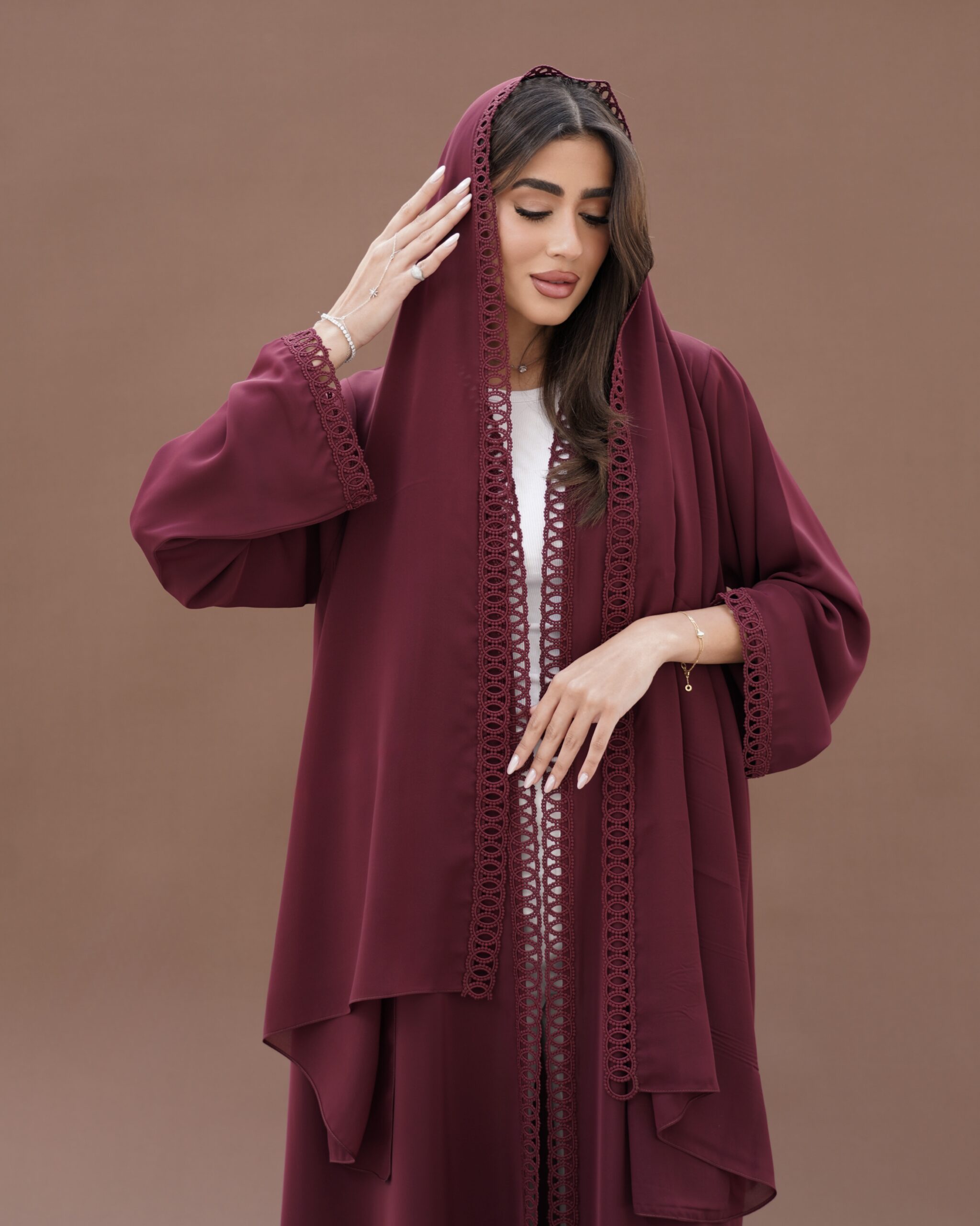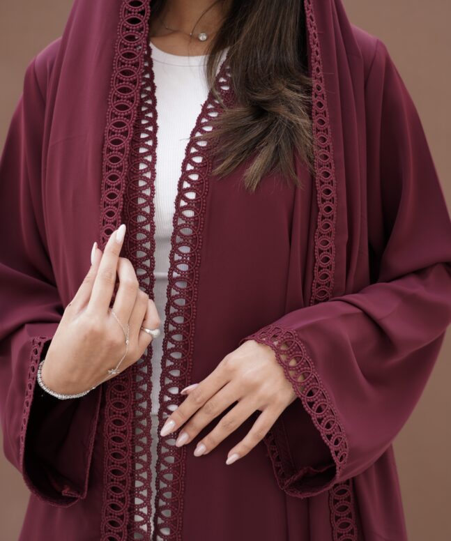 The minimalist plain design highlights the quality of the fabric, creating a sophisticated and versatile look suitable for all occasions. Paired with a matching plain lace Sheila, this abaya delivers a complete, polished ensemble with understated refinement.